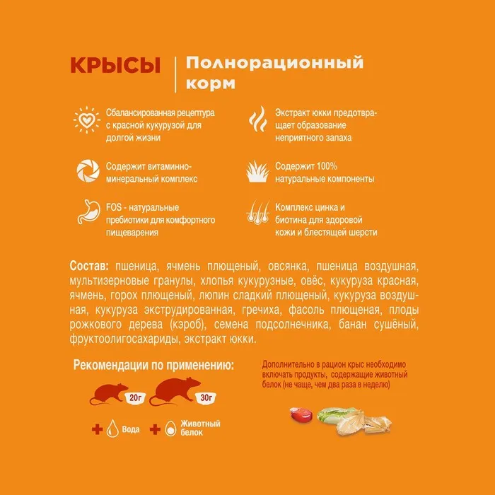 Разработан с учетом специфических потребностей крыс и содержит красную кукурузу, благоприятно влияющую на их здоровье и долголетие.