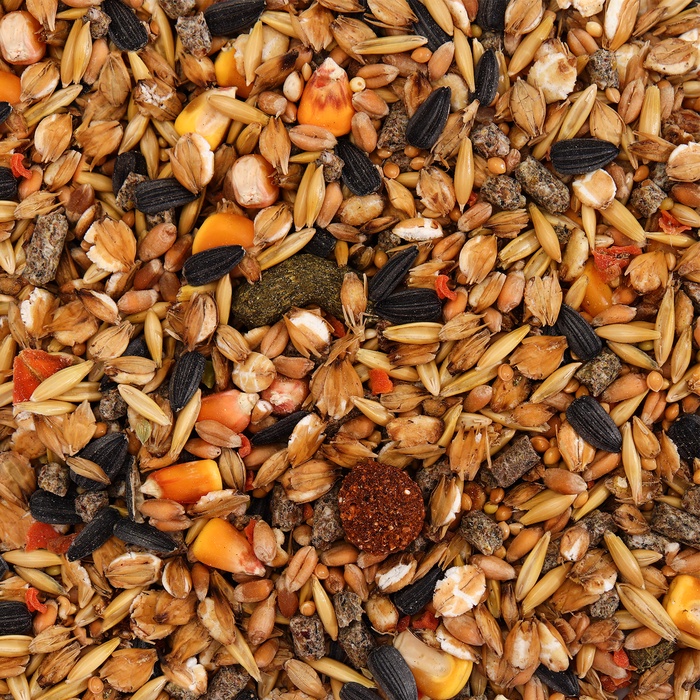 Состав: пшеница, овёс, просо жёлтое, ячмень воздушный, гранулы зерновые, кукуруза, семечка чёрная, гранулы экстрадированные, арахис.