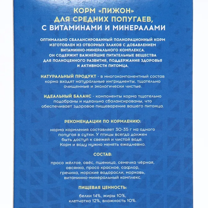 Корм "Пижон" для средних попугаев, с витаминами и минералами