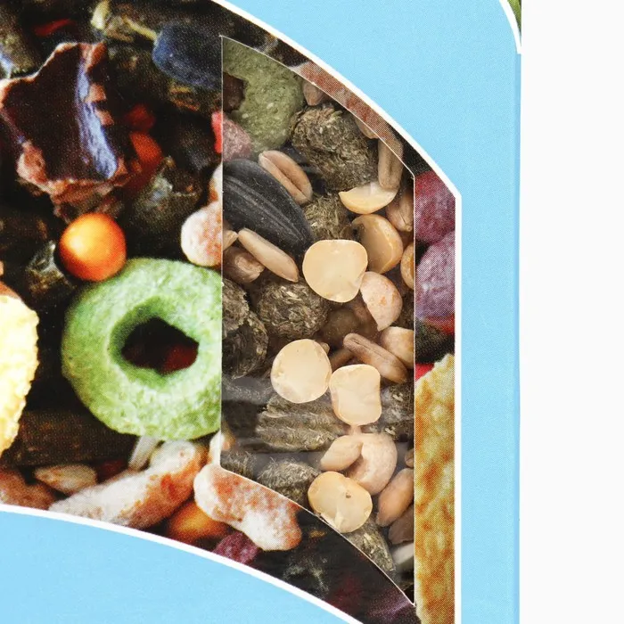 Состав: травяные гранулы, кукуруза, подсолнечник, горох, шиповник, кукурузные хлопья, попкорн, сафлор, экструдированные гранулы, орехи.