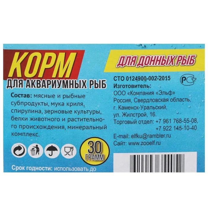 Корм повседневный для донных рыб «Аквакулинар», 30 г — Характеристики