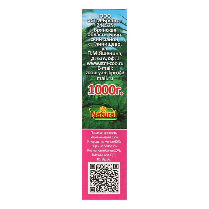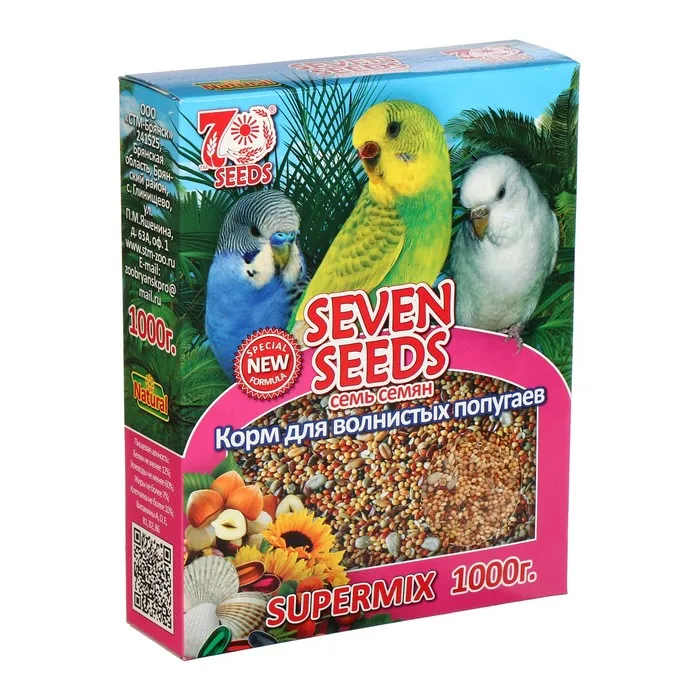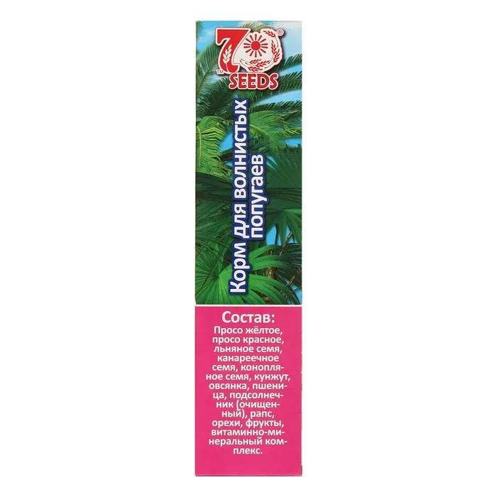 Состав: просо жёлтое, просо красное, льняное семя, канареечное семя, конопляное семя, кунжут, овсянка, пшеница, подсолнечник (очищенный), рапс, орехи, фрукты, витаминно-минеральный комплекс.