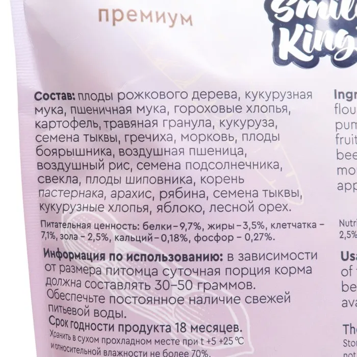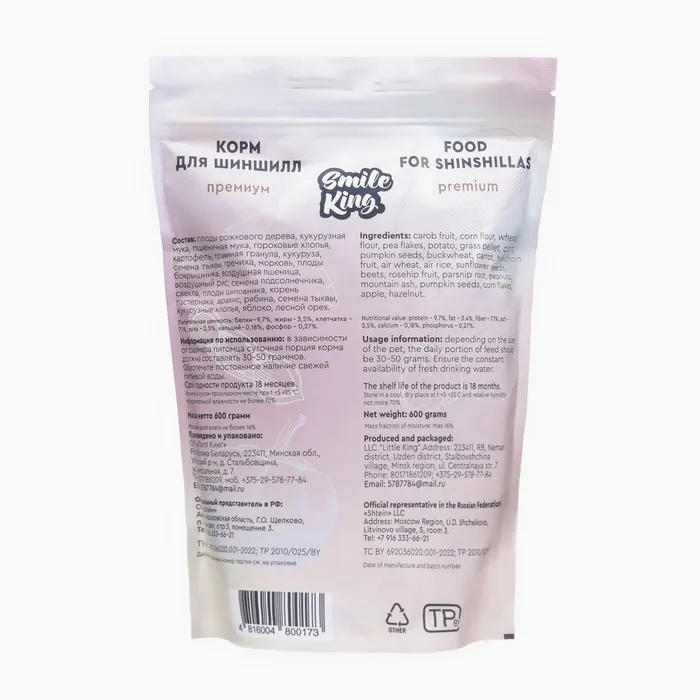 Полнорационный корм для шиншиллы изготовлен в Беларуси из экологически чистого, отборного сырья. Premium корма Smile King упаковываются в плотный пакет с зиплоком, что обеспечивает сохранность корма и удобство использования.