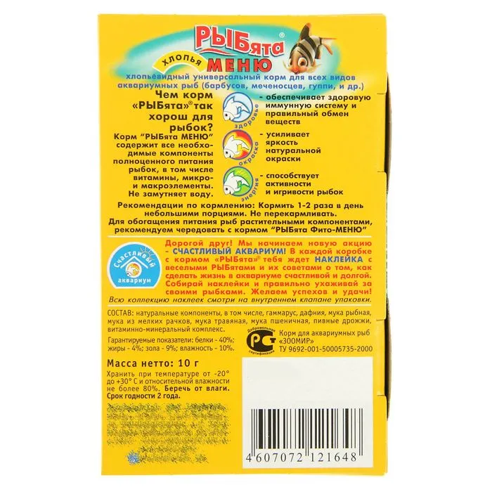 Корм универсальный "РЫБята МЕНЮ" (+ сюрприз) для рыб, хлопья, 10 г — Характеристики