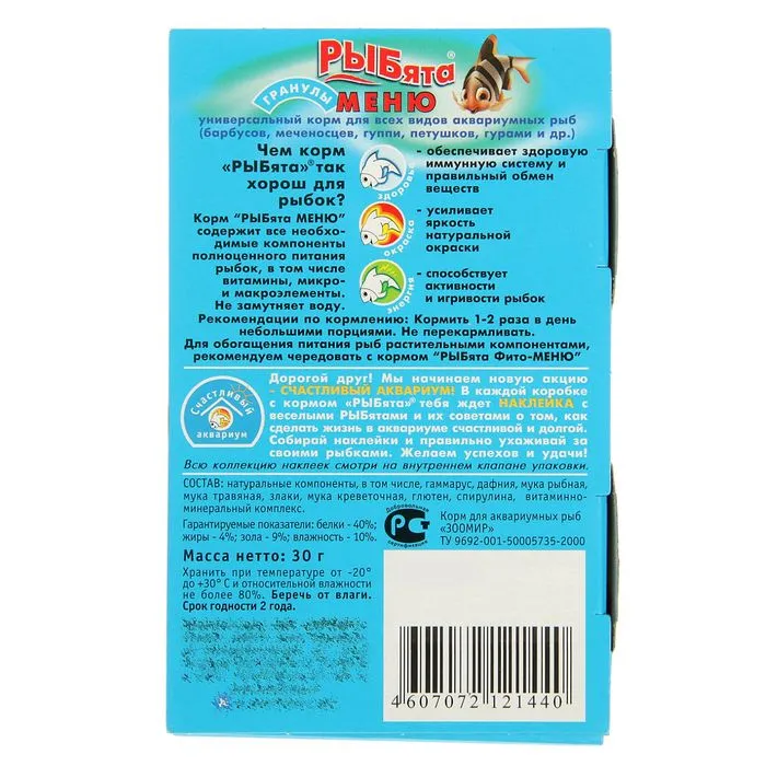 Корм универсальный "РЫБята МЕНЮ" (+ сюрприз) для рыб, коробка, гранулы, 30 г — Характеристики
