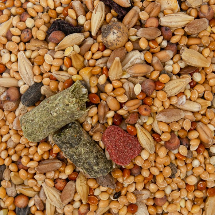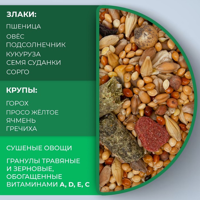 Состав: Горох, кукуруза, кукуруза плющенная, семена подсолнуха, семя суданки, гречиха, ячмень, овес, пшеница, сорго, травяные и зерновые гранулы, обогащенный витаминами A,D,E,C, просо желтое, сушеные овощи.