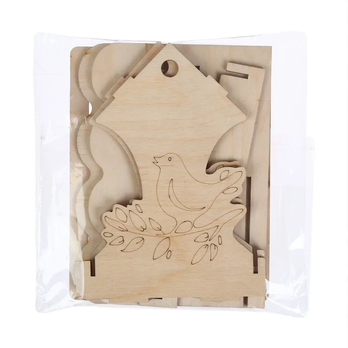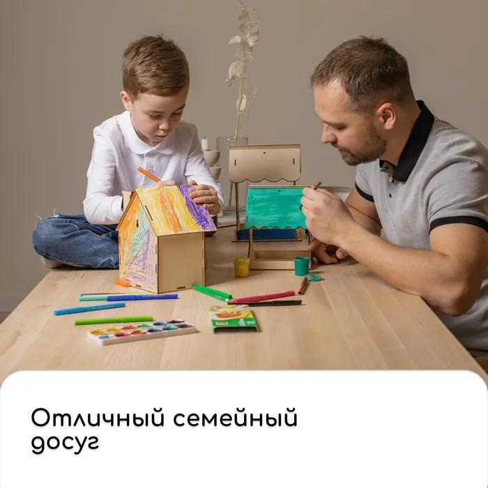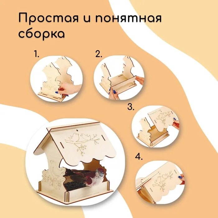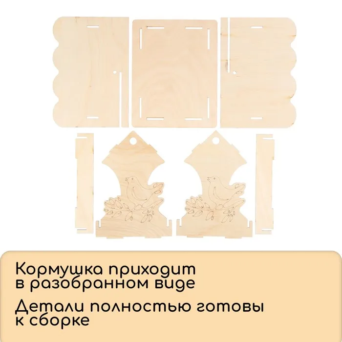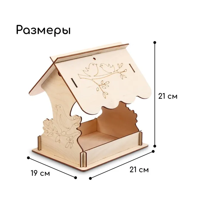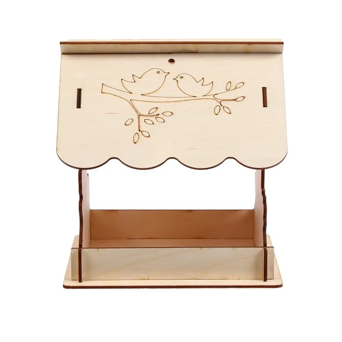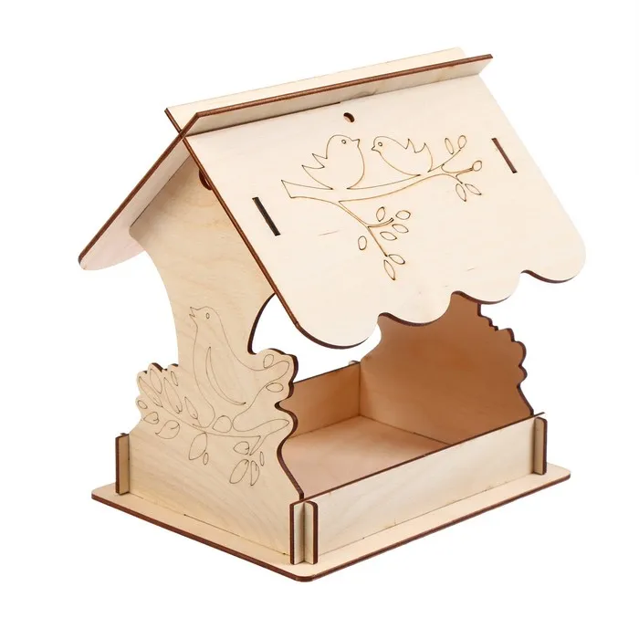 Чтобы собрать кормушку, аккуратно соедините фанерные детали, вставляя их в пазы. Используйте клей для лучшей фиксации. При желании модель можно раскрасить или задекорировать.
