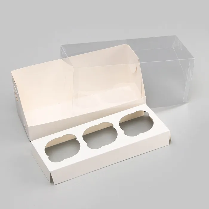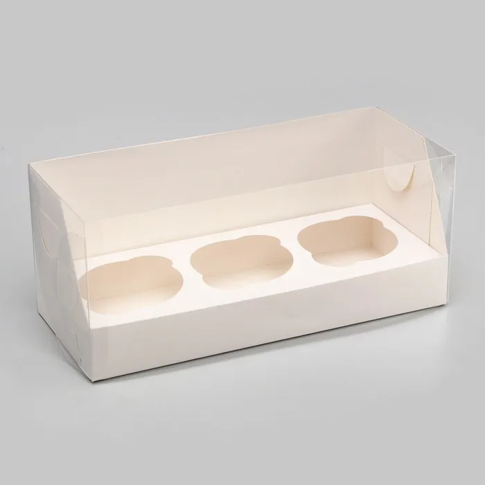 Кондитерская упаковка для 3 капкейков с прозрачной крышкой и удобными ручками - идеальное решение для упаковки и транспортировки свежих капкейков. Ее элегантный дизайн позволяет видеть внутренний содержимый, создавая аппетитный вид и придавая капкейкам особую презентацию. Прочные ручки облегчают переноску, что делает эту упаковку удобной и практичной для подарка и продажи домашних сладостей. Подарите свои вкусные капкейки в стильной и функциональной упаковке.