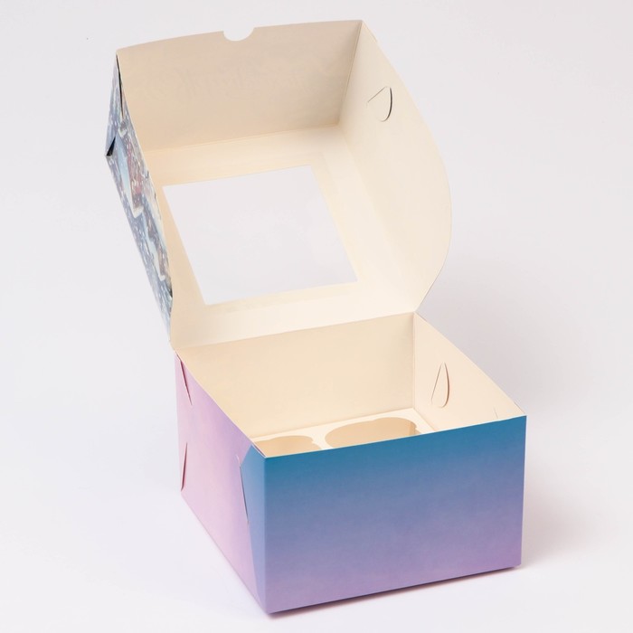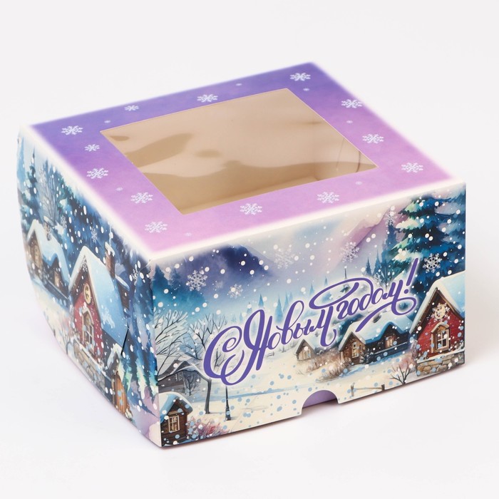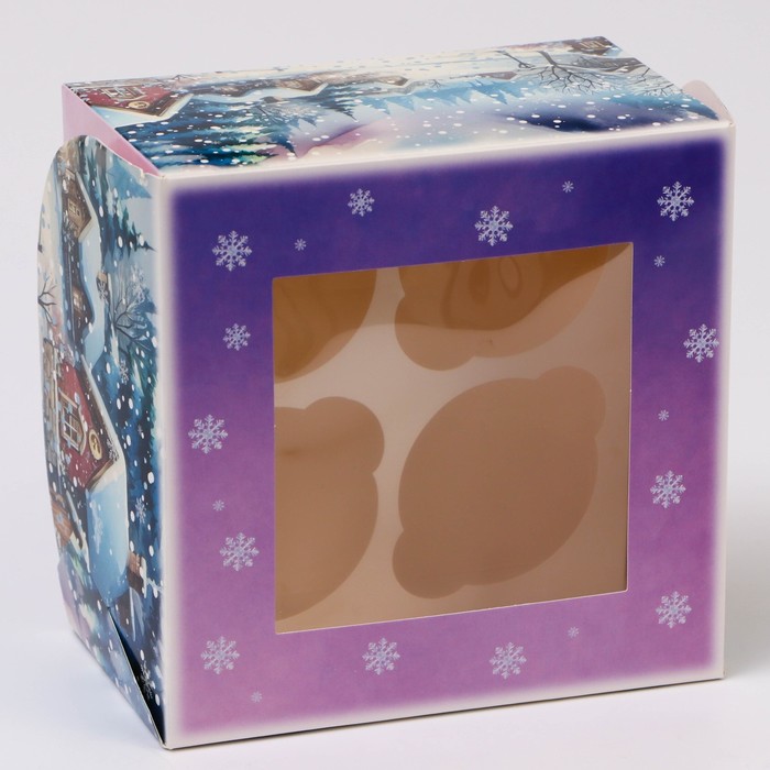 Коробка для 4 капкейка с окном «Зимняя деревушка», 16×16×10 см, упаковка