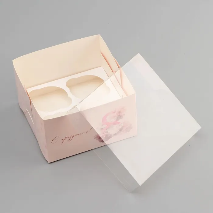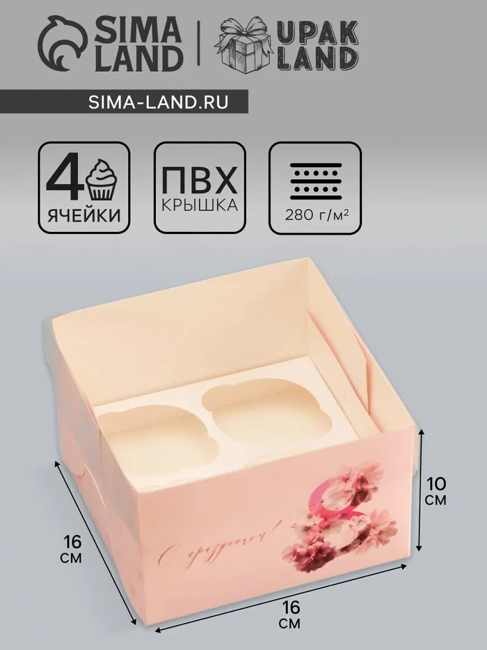 Коробка для 4 капкейка с прозрачной крышкой, «8 марта», 16×16×10 см — Характеристики