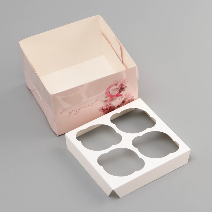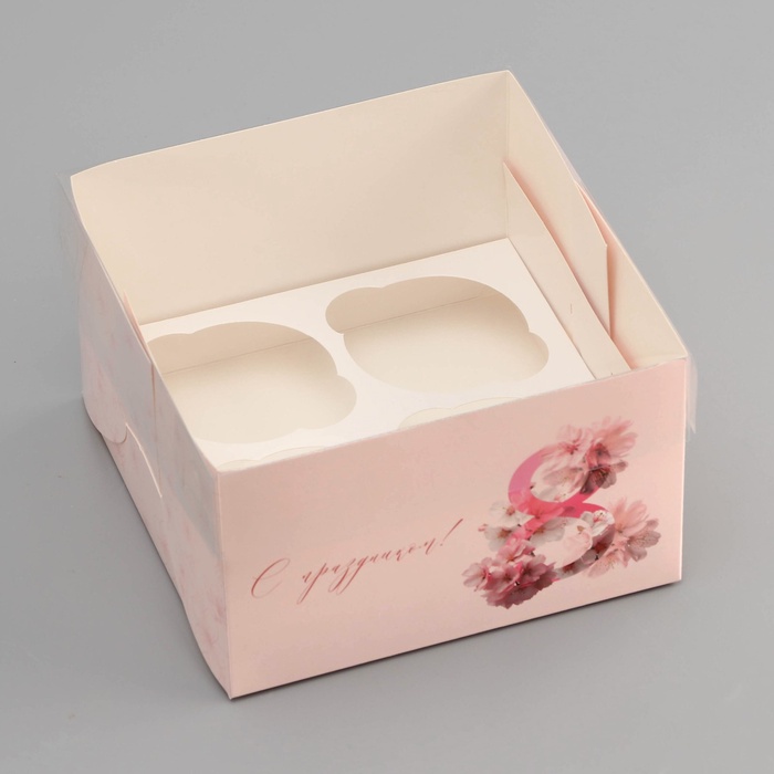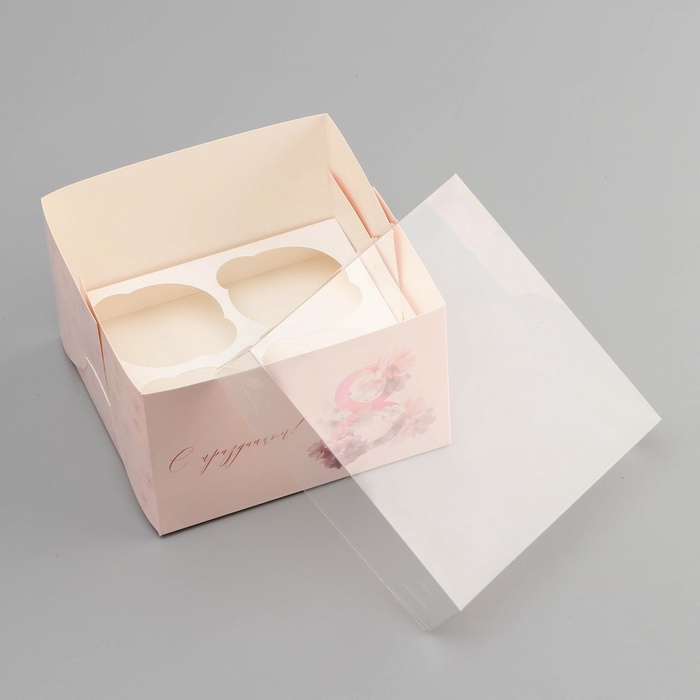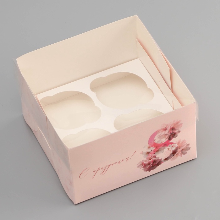 Коробка для 4 капкейка с прозрачной крышкой, «8 марта», 16×16×10 см