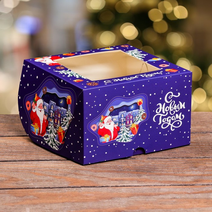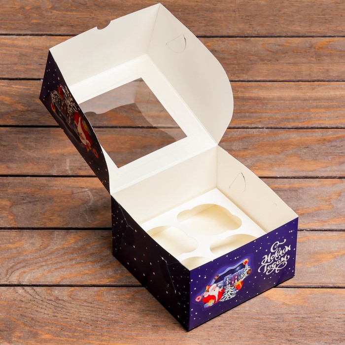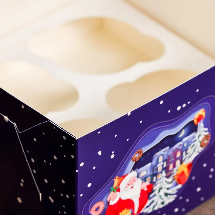 Коробка выполнена из прочного картона и украшена новогодним дизайном. Специальные вставки внутри коробки надежно фиксируют капкейки, защищая их от смещения и повреждений.
