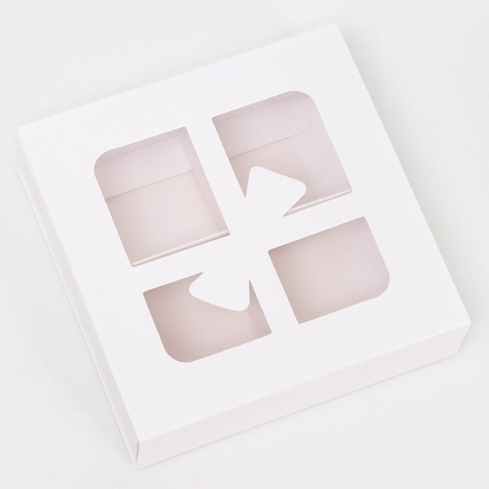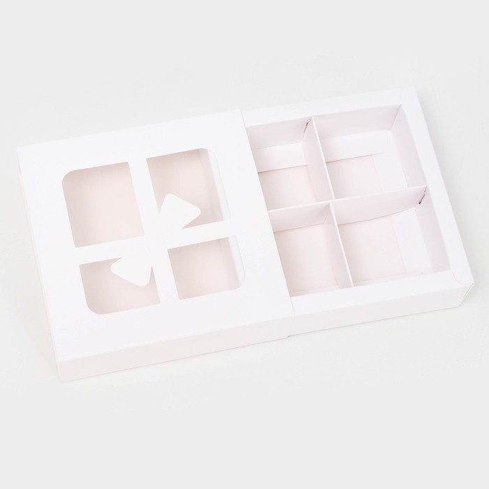 Коробка предназначена для упаковки и транспортировки четырех конфет. Она имеет достаточную вместимость для того, чтобы защитить продукты от повреждений и сохранить их свежесть.