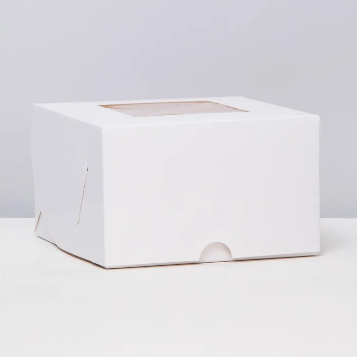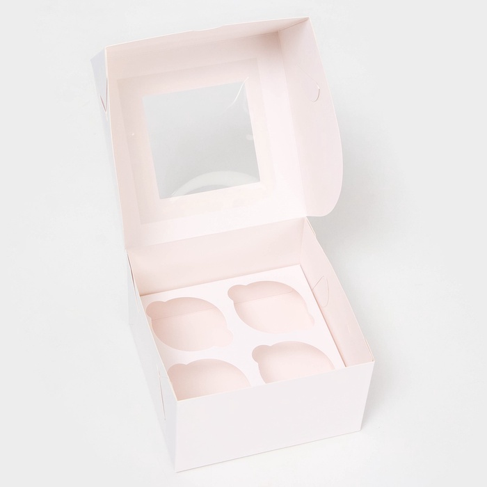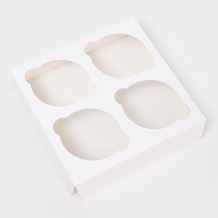 Кондитерская упаковка на 4 мини-капкейка имеет размеры 13 см в длину, 13 см в ширину и 8 см в высоту. Она выполнена из белого картона с прозрачным окном, что придает ей элегантный и классический вид, а также позволяет видеть содержимое без необходимости открывать упаковку.