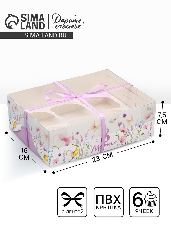Коробка для 6 капкейков с окном, «8 марта», 25×17×10 см — Характеристики