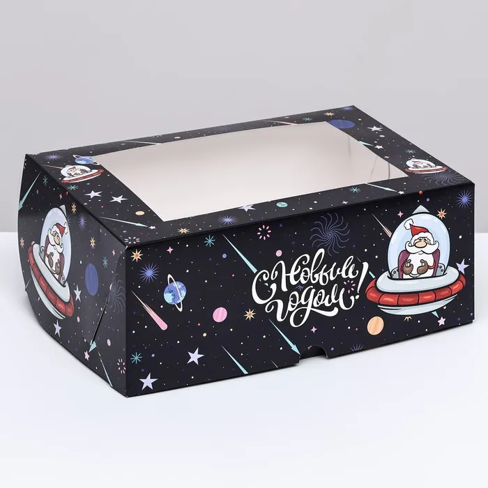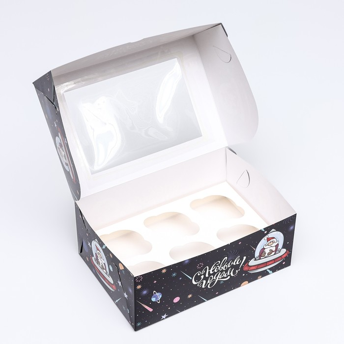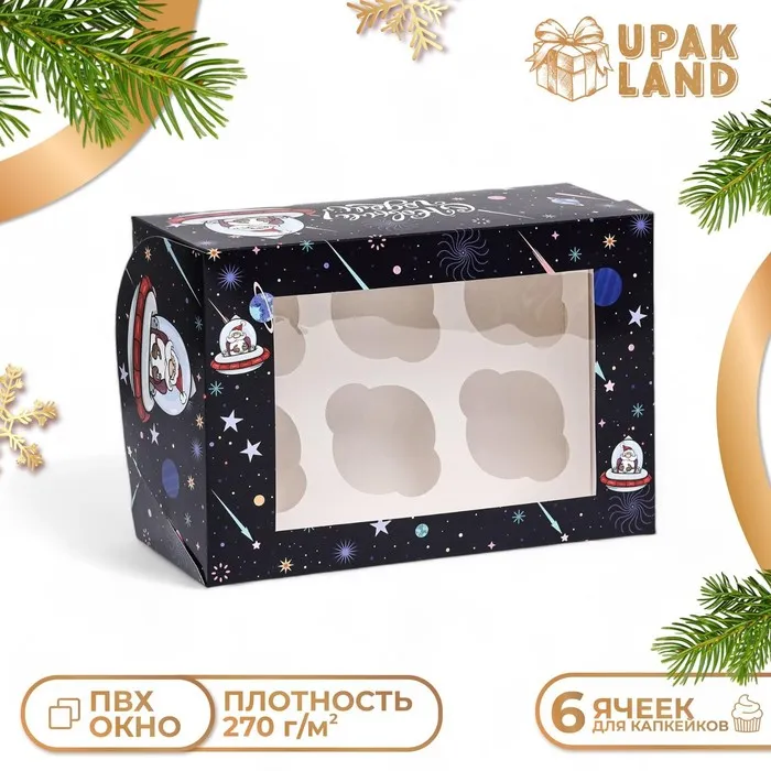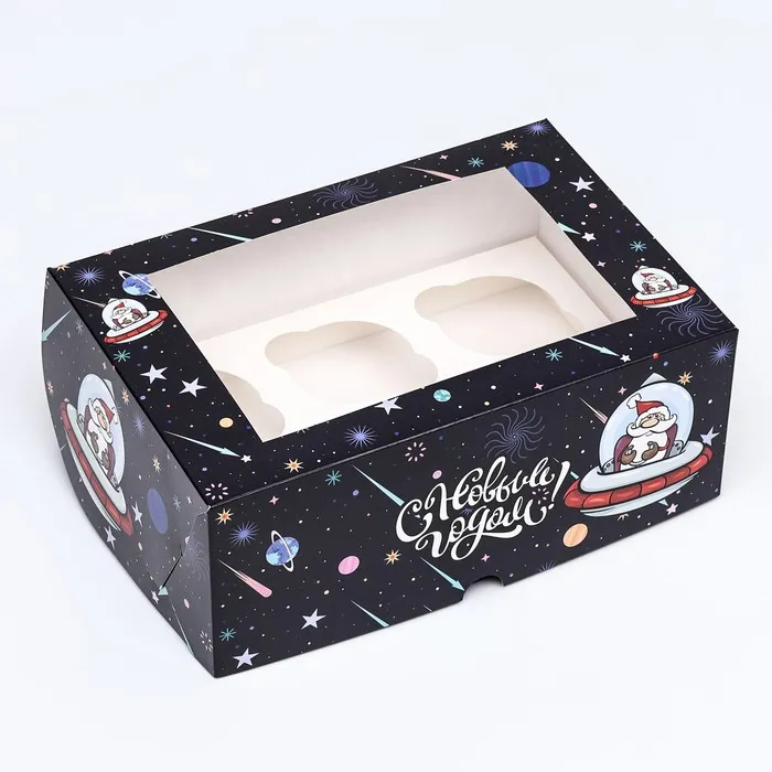 Коробка для 6 капкейков с окном подарочная новогодняя упаковка, "Космический Дед Мороз», 25×17×10 см — Характеристики