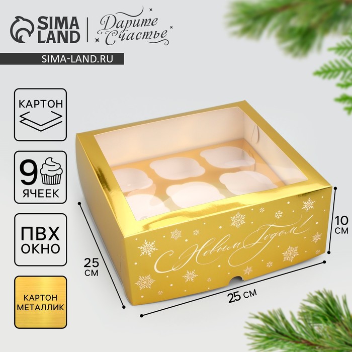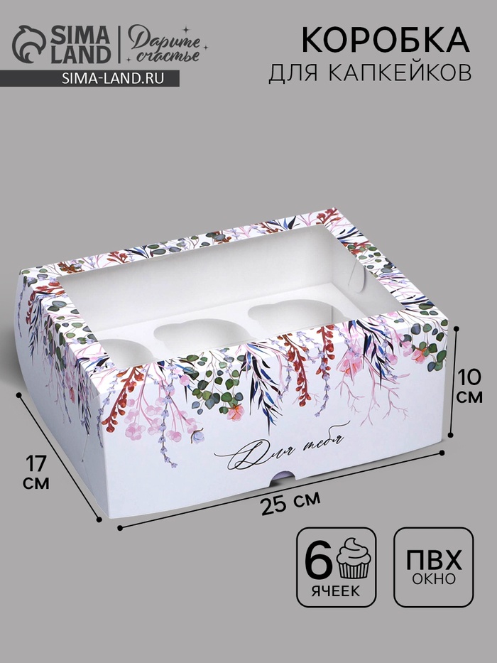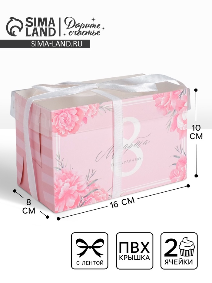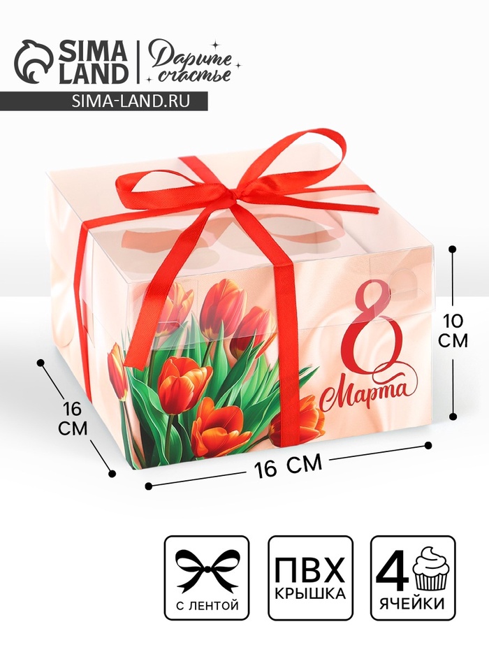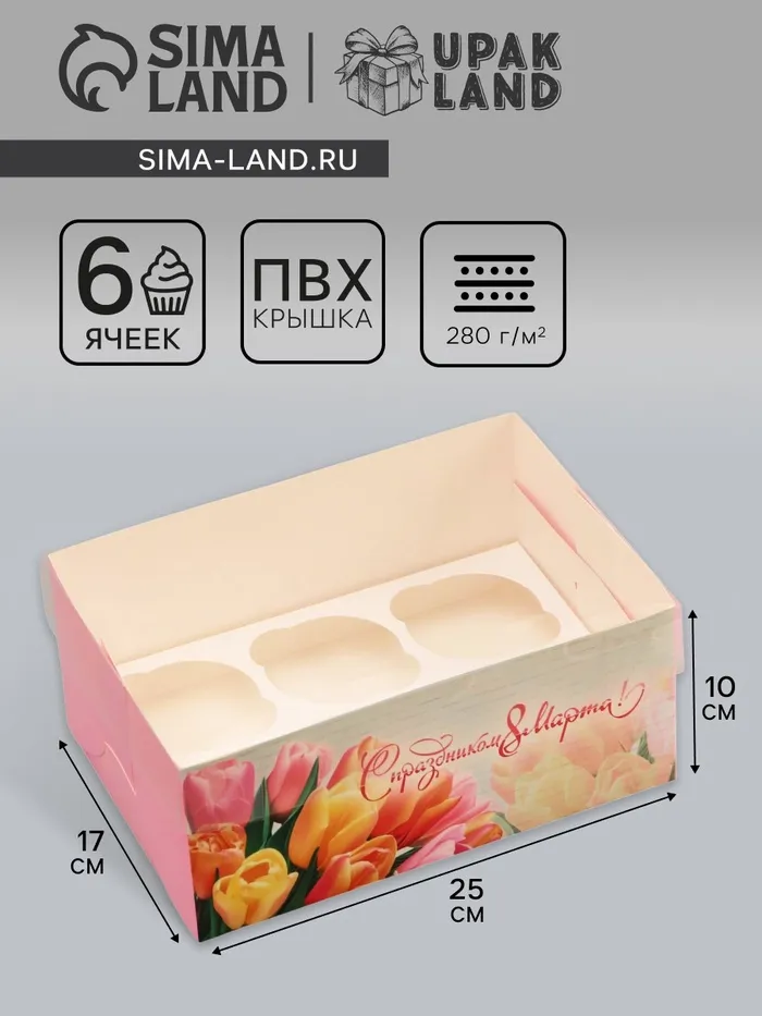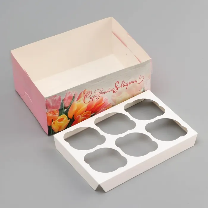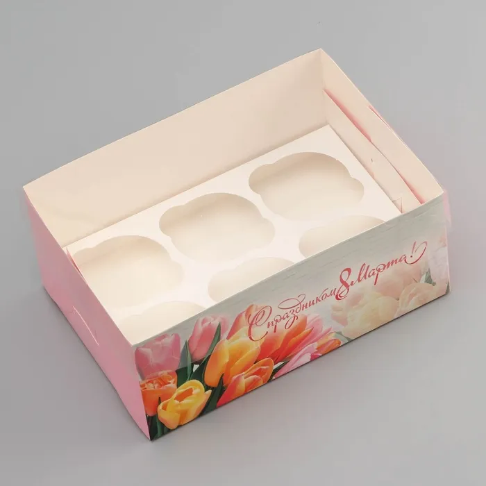 Коробка для 6 капкейков с прозрачной крышкой, «С праздником 8 марта», 23×16×10 см — Характеристики