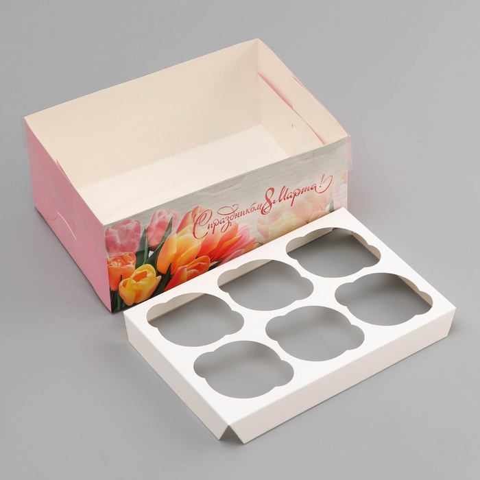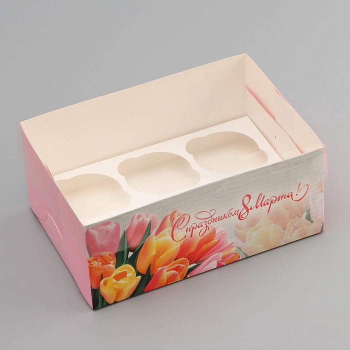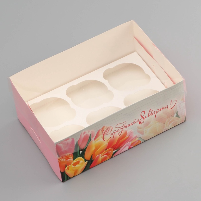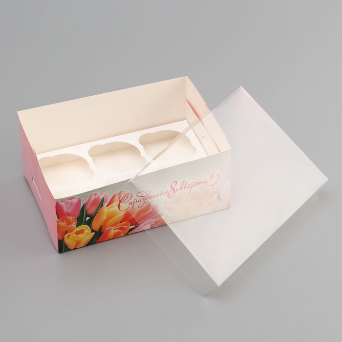 Коробка для 6 капкейков с прозрачной крышкой, «С праздником 8 марта», 23×16×10 см