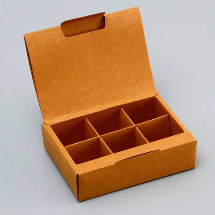 - Внутри предусмотрено разделение на 6 ячеек, что позволяет аккуратно разместить каждую конфету, предотвращая их смещение во время транспортировки.