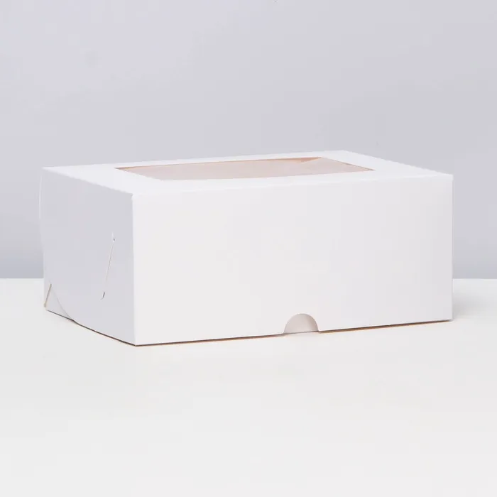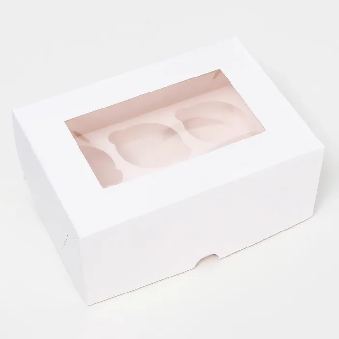 Кондитерская упаковка на 6 мини-капкейков имеет размеры 18,6 см в длину, 13,1 см в ширину и 8 см в высоту. Она выполнена из белого картона с прозрачным окном, что придает ей элегантный и классический вид, а также позволяет видеть содержимое без необходимости открывать упаковку.