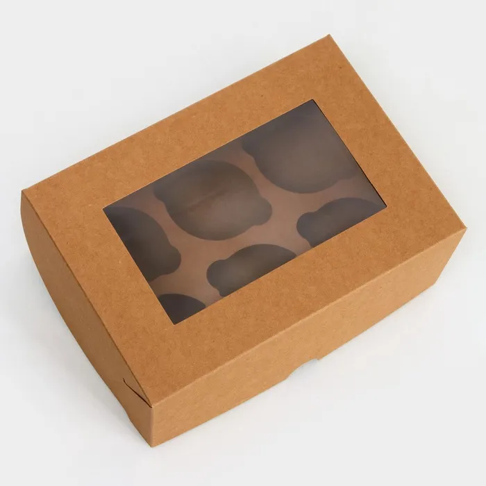 Кондитерская упаковка на 6 мини-капкейков имеет размеры 18,6 см в длину, 13,1 см в ширину и 8 см в высоту. Она выполнена из крафт-картона с прозрачным окном, что придает ей естественный и экологичный вид, а также позволяет видеть содержимое без необходимости открывать упаковку.