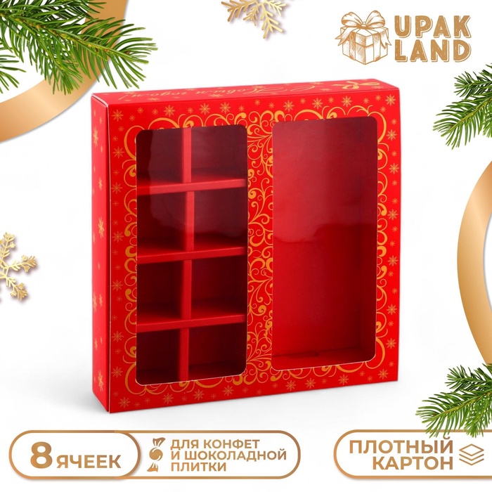 Изготовлена из высококачественного картона, она идеально подходит для 8 конфет и одной плитки шоколада.