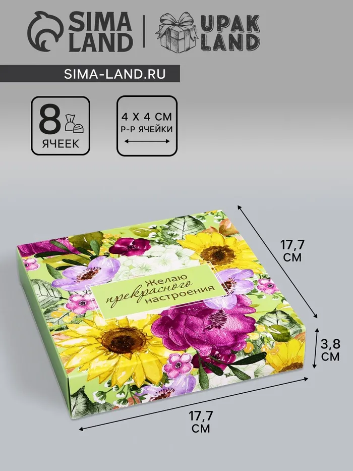 Коробка для 8 конфет и шоколада — это идеальное сочетание элегантности и функциональности, созданное для тех, кто ценит сладкие моменты в жизни. Эту коробку размером 17,7 х 17,8 х 3,8 см можно с гордостью представить на любом празднике, будь то день рождения, свадьба или корпоративное мероприятие.