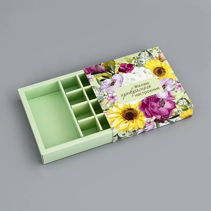 Оптимальные размеры позволяют разместить восемь изысканных конфет и небольшой шоколадный плитку. Эта коробка становится не только привлекательным, но и практичным решением для подачи сладостей, которые могут порадовать как вас, так и ваших близких.