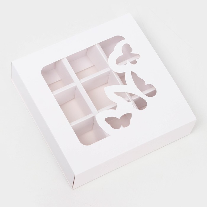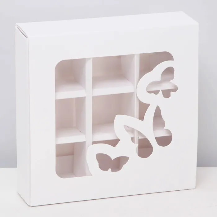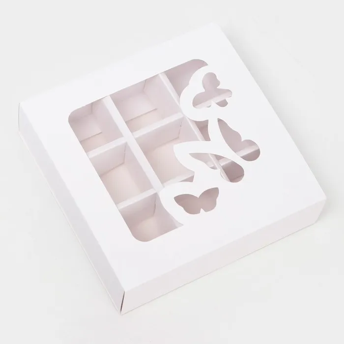 Коробка под 4 конфет вырубка "Бабочки" имеет размеры 13,7 х 13,7 х 3,8 см. Она выполнена из белого картона высокого качества, что обеспечивает прочность и долговечность.