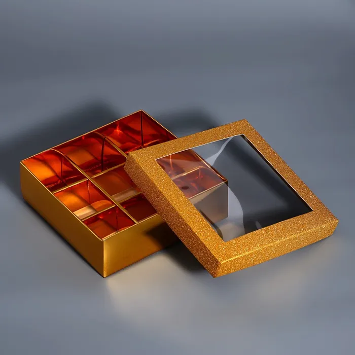 Коробка для девяти конфет с золотым глиттером — это отличный подарок для друзей и близких, который порадует их своим внешним видом и качеством исполнения.