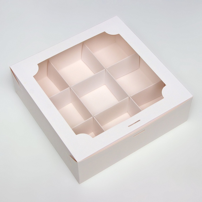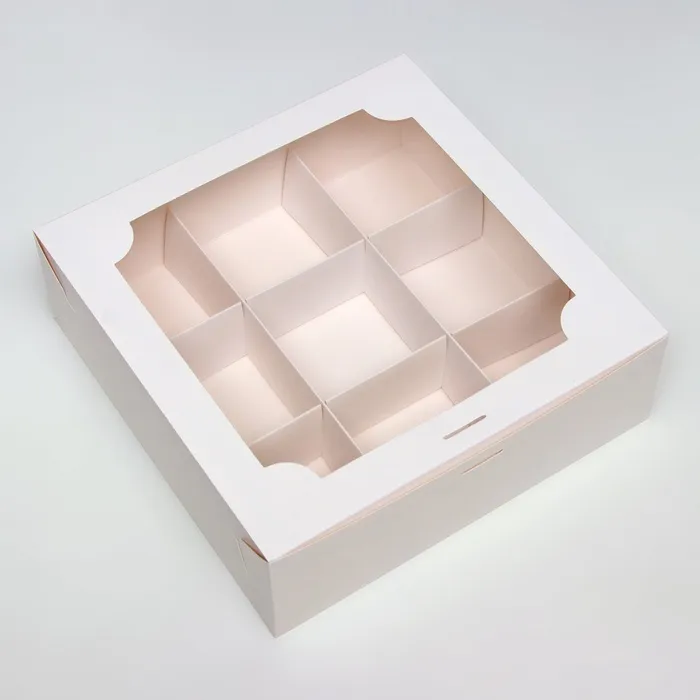 Внутреннее пространство разделено на девять ячеек, что позволяет удобно разместить каждое пирожное или капкейк отдельно.