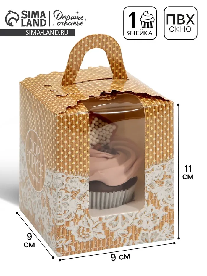 Коробка для капкейков, кондитерская упаковка, 1 ячейка «Сюрприз внутри», 9 х 9 х 11 см — Характеристики
