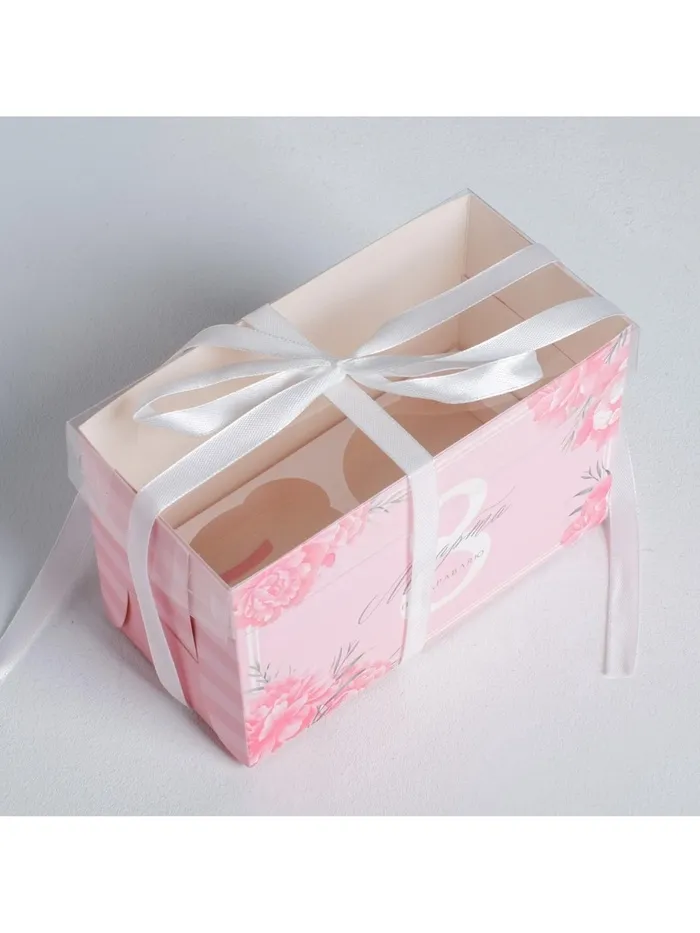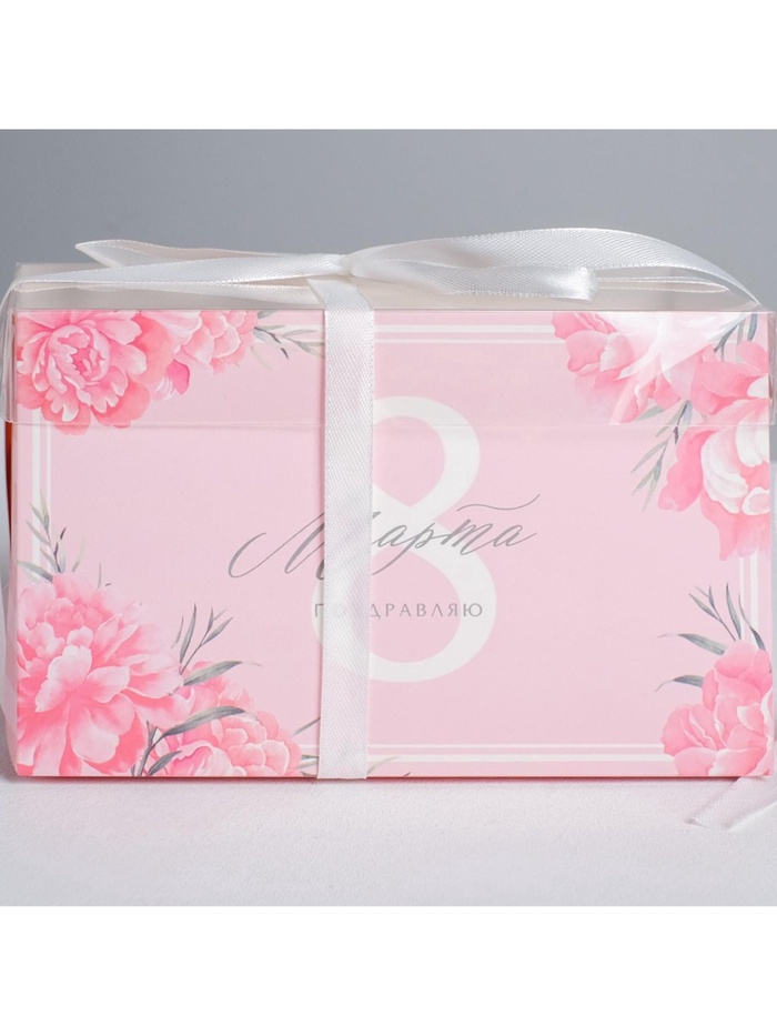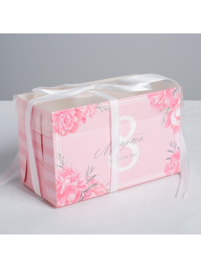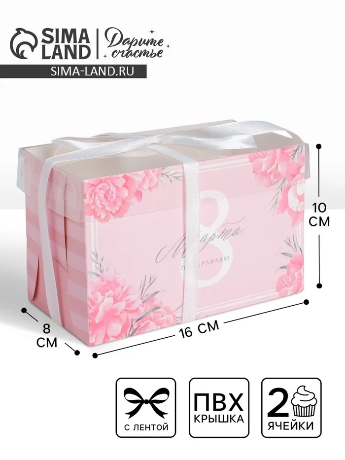 Коробка для капкейков, кондитерская упаковка, 2 ячейки «Поздравляю с 8 марта», 16 х 8 х 10 см — Характеристики