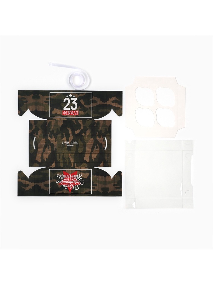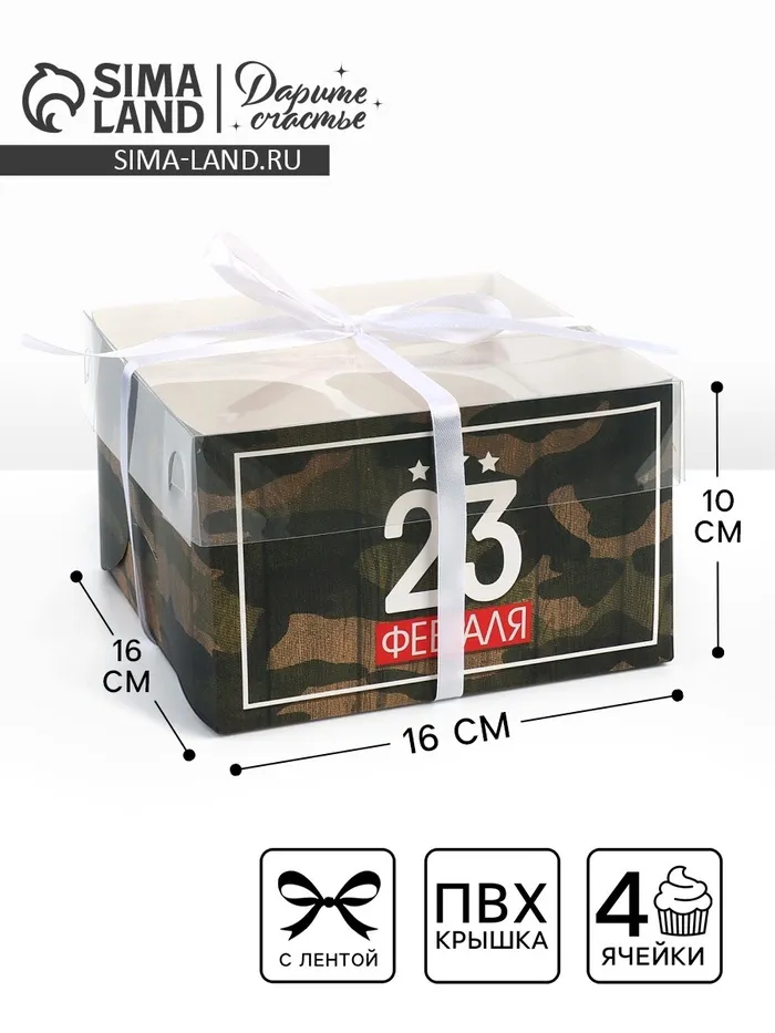 Коробка для капкейков, кондитерская упаковка, 4 ячейки «23 Февраля», 16 х 16 х 10 см — Характеристики