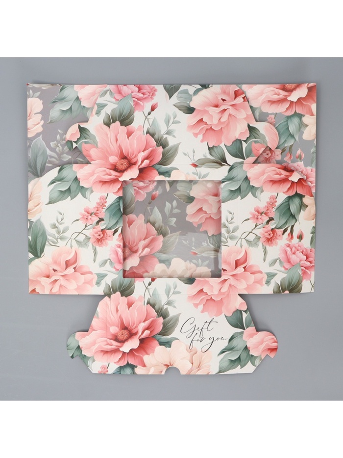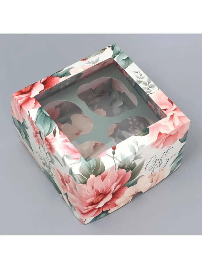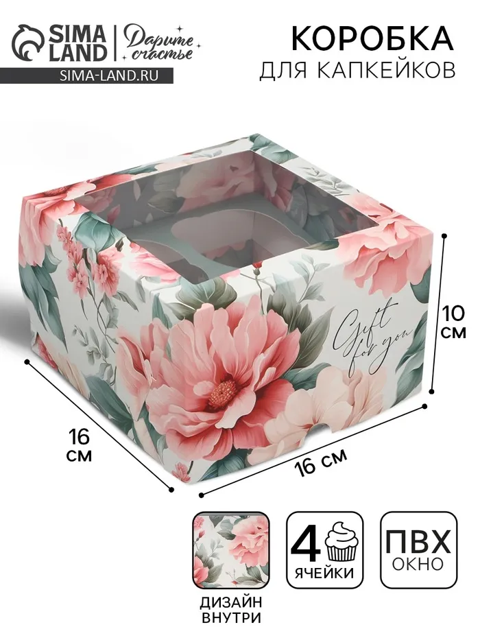 Коробка для капкейков, кондитерская упаковка двухсторонняя, 4 ячейки «Пионы» 16 х 16 х 10 см — Характеристики