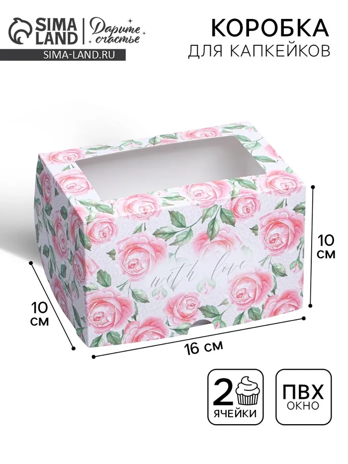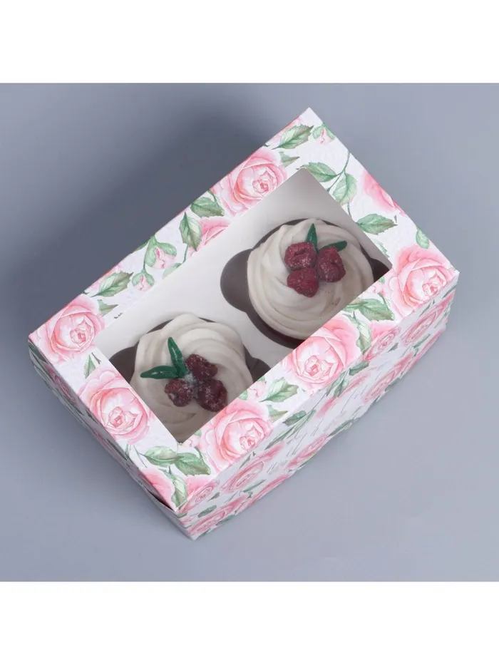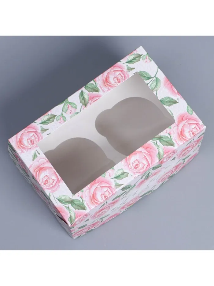 Коробка для капкейков, кондитерская упаковка с окном, 2 ячейки, «Розы», 16 х 10 х 10 см — Характеристики