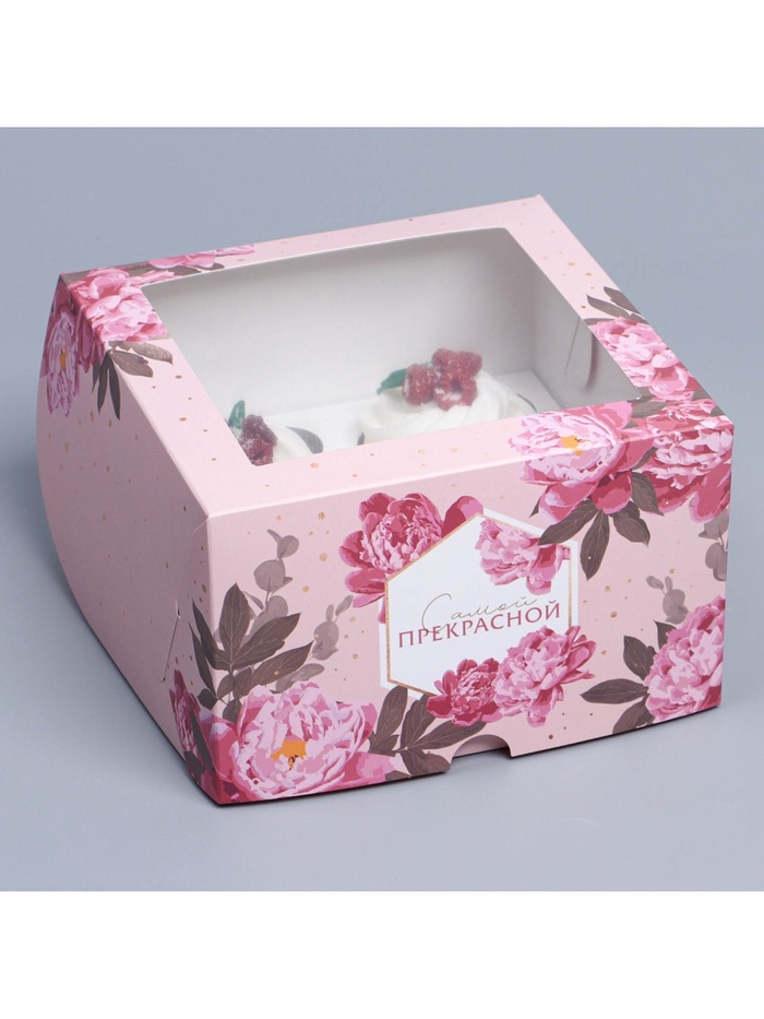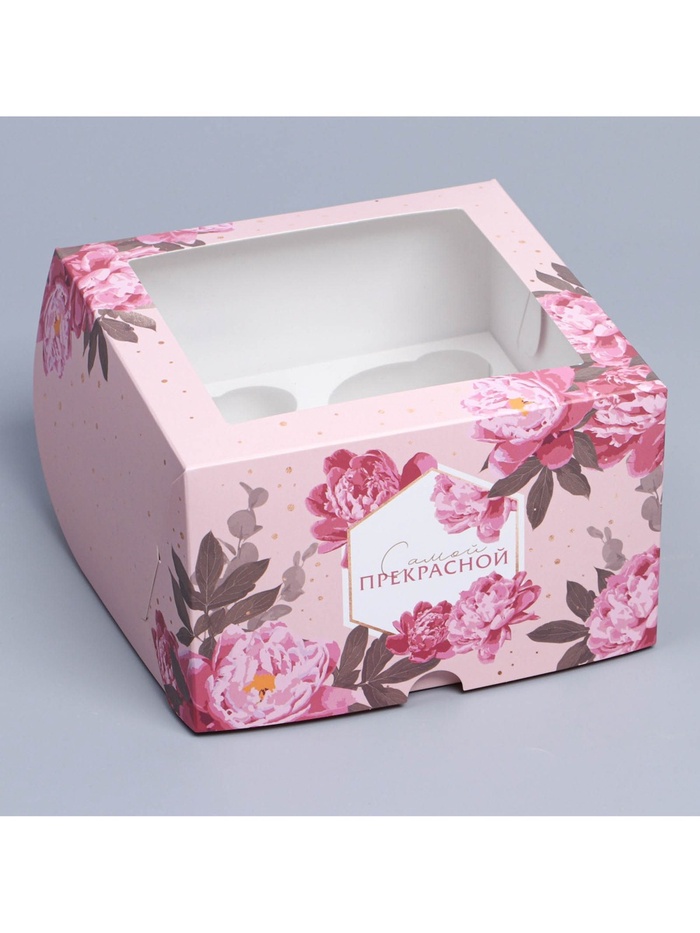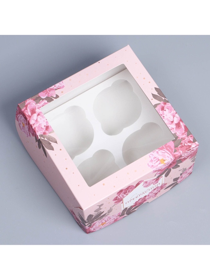 Коробка для капкейков, кондитерская упаковка с окном, 4 ячейки «Цветы», 16 х 16 х 10 см — Характеристики