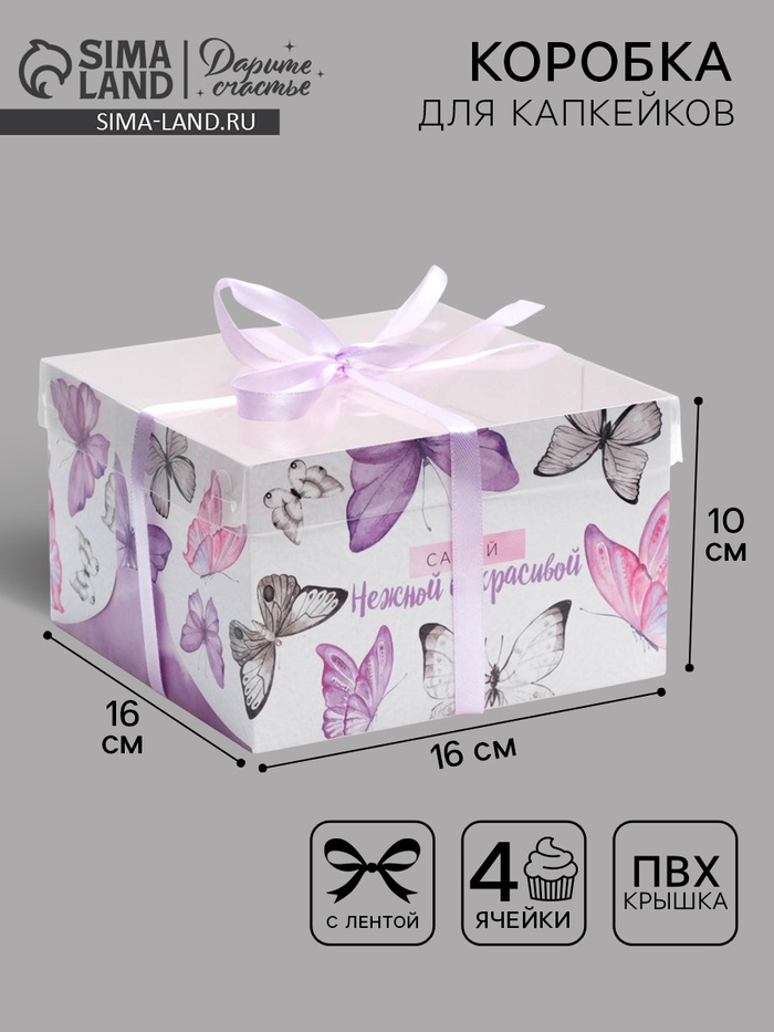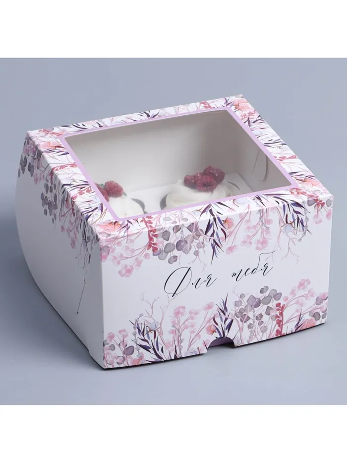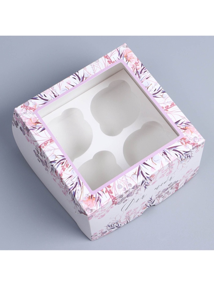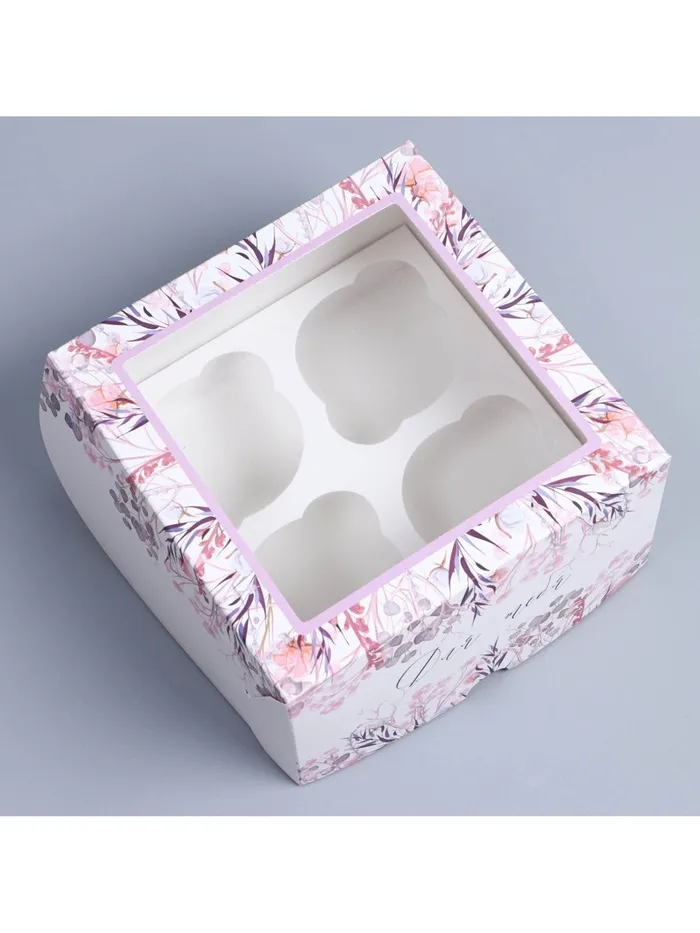 Коробка для капкейков, кондитерская упаковка с окном, 4 ячейки «Венок», 16 х 16 х 10 см — Характеристики
