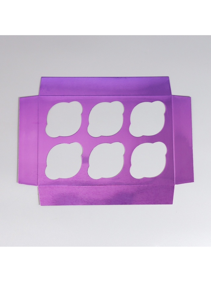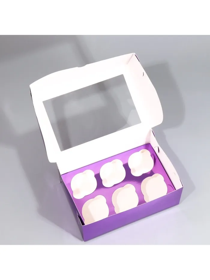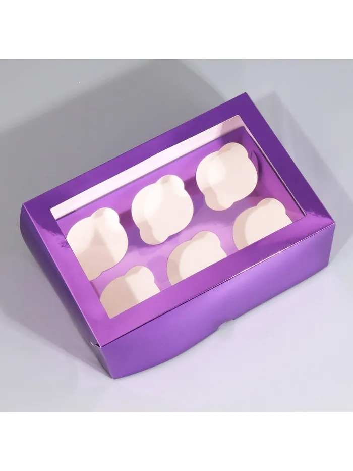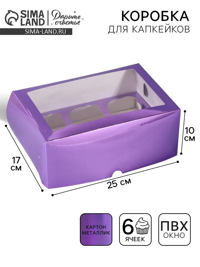 Коробка для капкейков, кондитерская упаковка с окном, 6 ячеек «Фиолетовая», 25 х 17 х 10 см — Характеристики