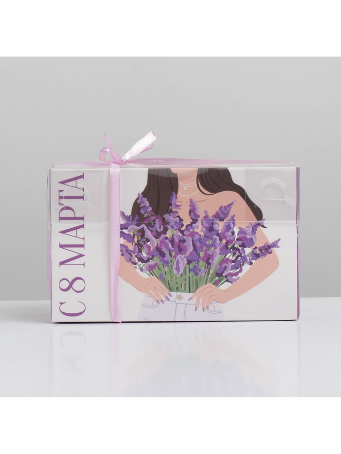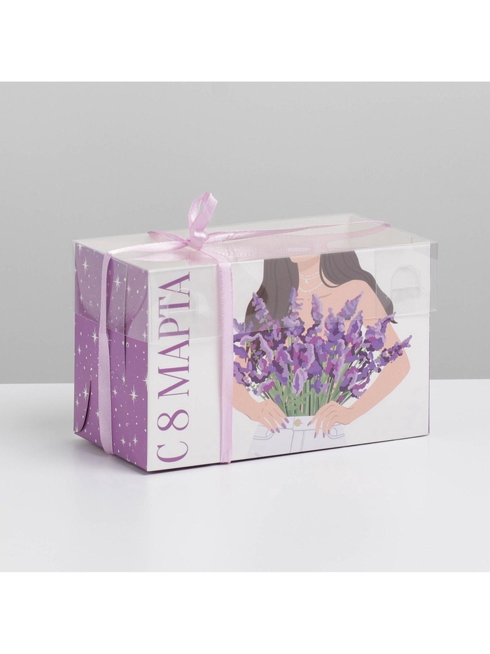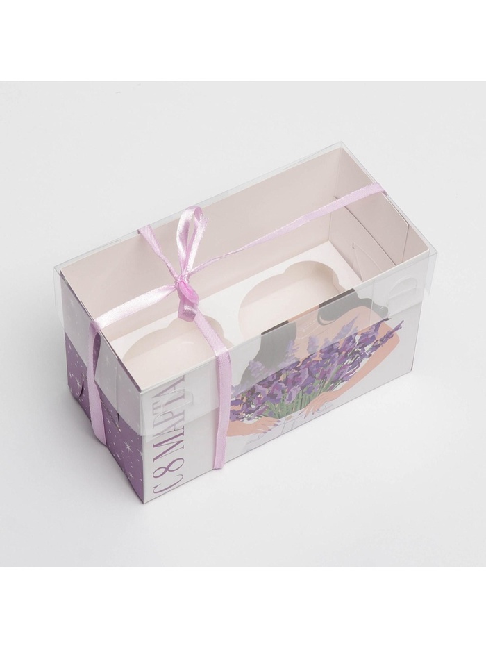 Коробка для капкейков, кондитерская упаковка с пластиковой крышкой, 2 ячейки, «8 марта», 16 х 8 х 10 см — Характеристики