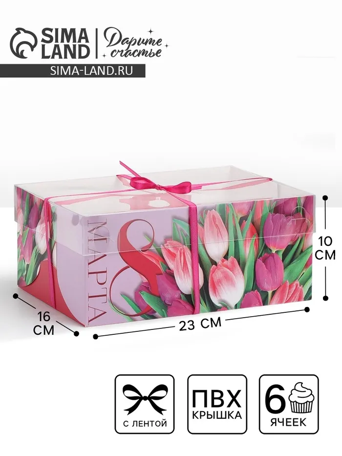Коробка для капкейков, кондитерская упаковка с пластиковой крышкой, 6 ячеек «8 марта», 23 х 16 х 10 см — Характеристики