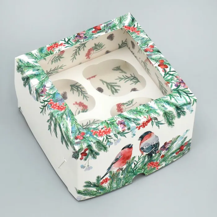 Коробка для капкейков складная с двусторонним нанесением «Снегири», 16 х 16 х 10 см