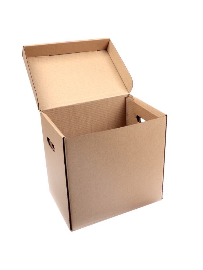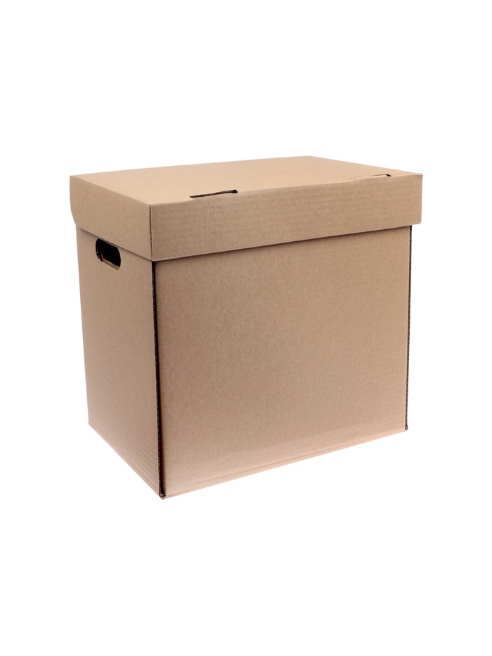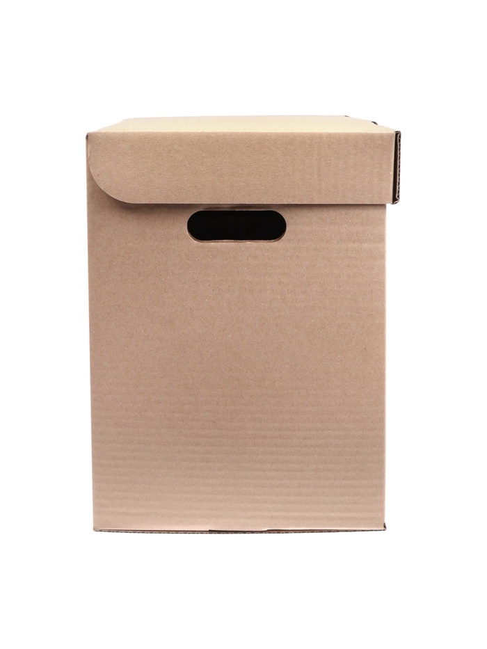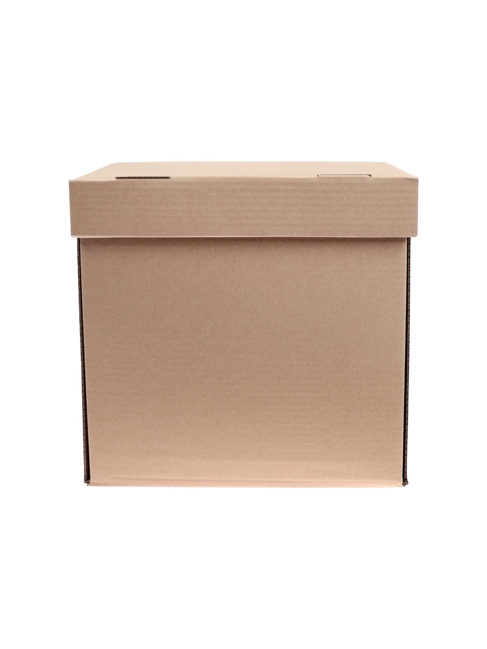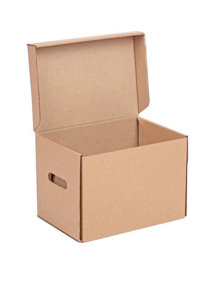 Он сделан из высококачественного бурого гофрокартона и способен выдерживать вес до 15–18 килограммов. У короба есть откидная крышка и отверстия по бокам для удобной переноски. Размер — 325×235×325 мм. Поставляется в разобранном виде и легко собирается без скотча и ножниц.