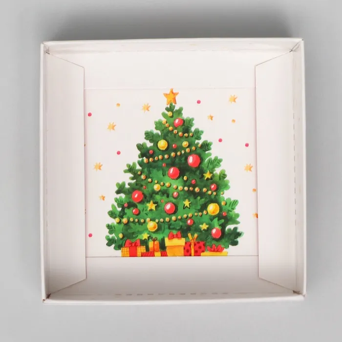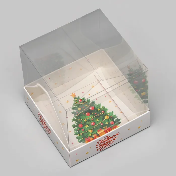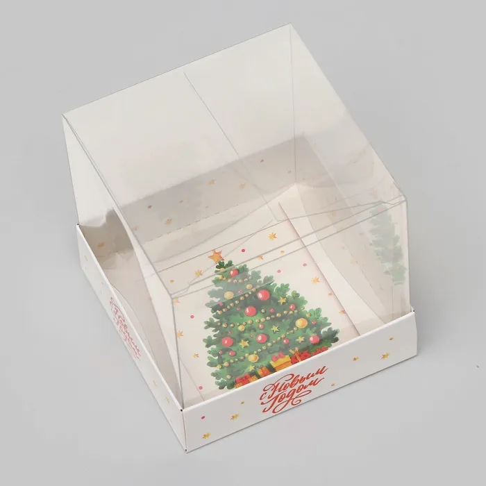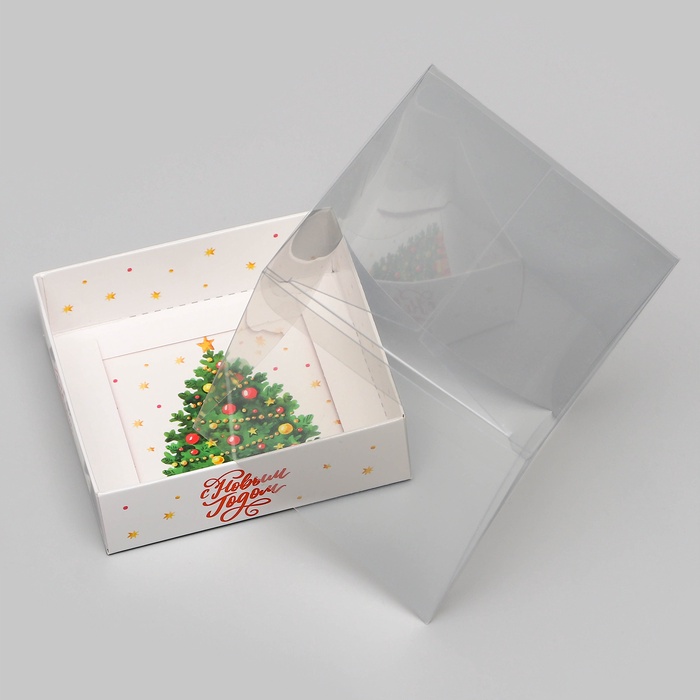 Новогодняя коробка для кондитерских изделий с ПВХ крышкой размером 10 х 10 х 10 см — идеальное решение для упаковки праздничных сладостей!