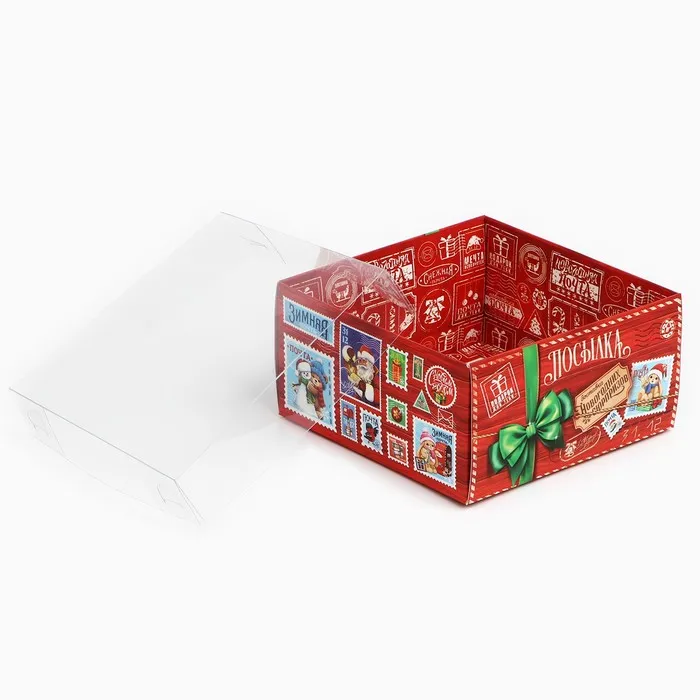 Коробка для кондитерских изделий с пластиковой крышкой «Новогодняя посылка», 12 х 6 х 11.5 см — Характеристики
