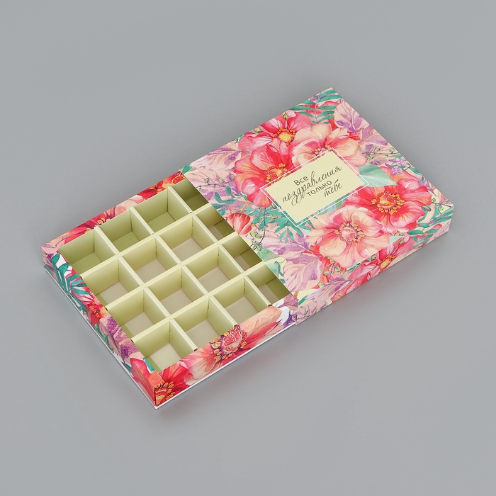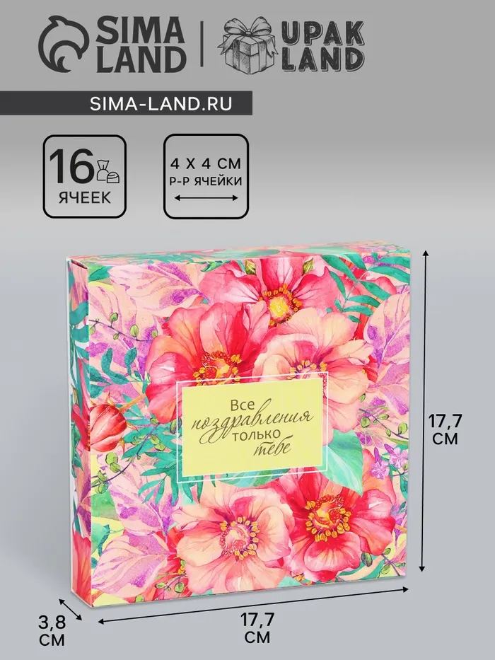 Коробка для конфет размером 17,7 х 17,7 х 3,8 см идеально подходит для хранения и презентации 16 конфет.