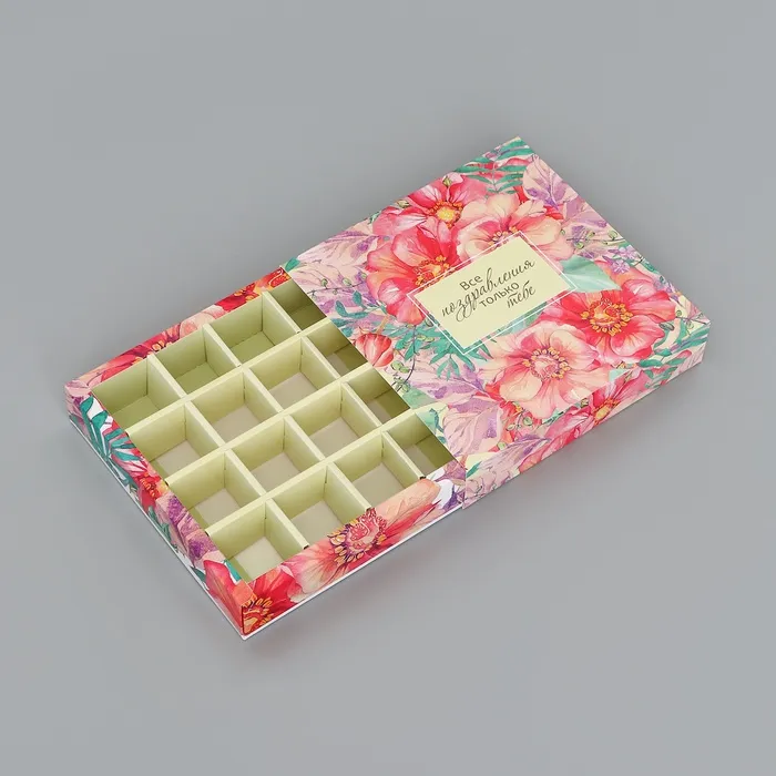 - Эта коробка станет отличным выбором для упаковки конфет на любой праздник, будь то день рождения, юбилей или просто в качестве подарка близким и друзьям.