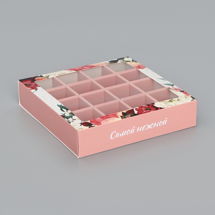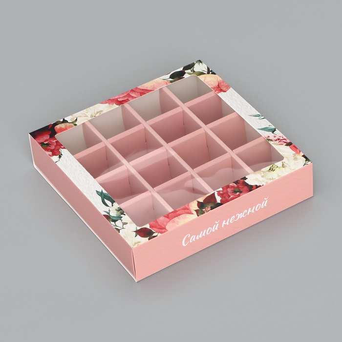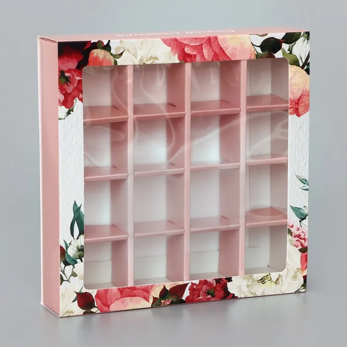 Коробка для конфет размером 17,7 х 17,7 х 3,8 см идеально подходит для хранения и презентации 16 конфет.