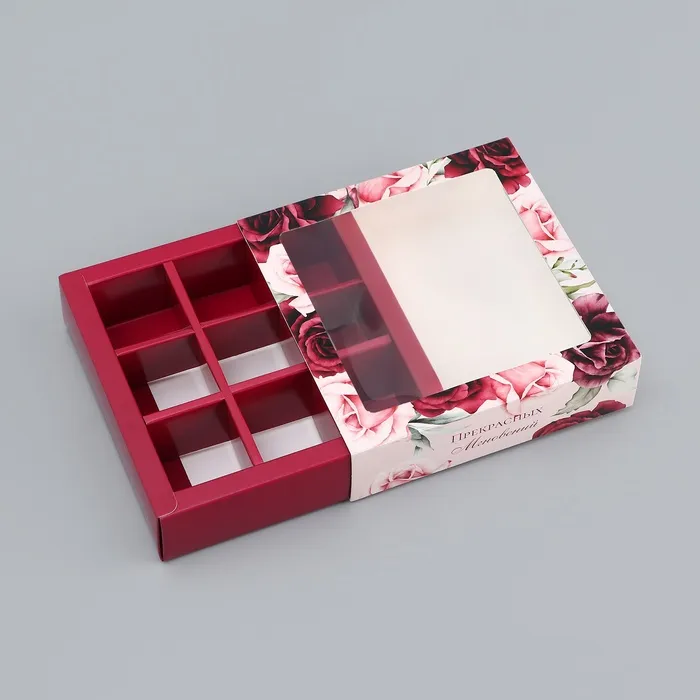 Подарочная коробка для конфет – идеальный вариант для создания праздничного настроения на 14 февраля, 8 марта. Она вмещает ровно 9 конфет, что делает её компактной и аккуратной, но в то же время способной подарить массу удовольствия.