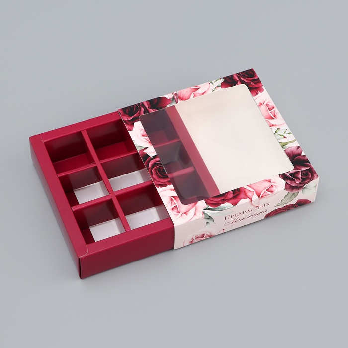 Подарочная коробка для конфет – идеальный вариант для создания праздничного настроения на 14 февраля, 8 марта. Она вмещает ровно 9 конфет, что делает её компактной и аккуратной, но в то же время способной подарить массу удовольствия.